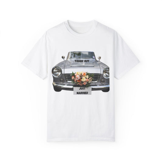 Men's T-Shirt Tough Guy Car with Just Married Flowers Design