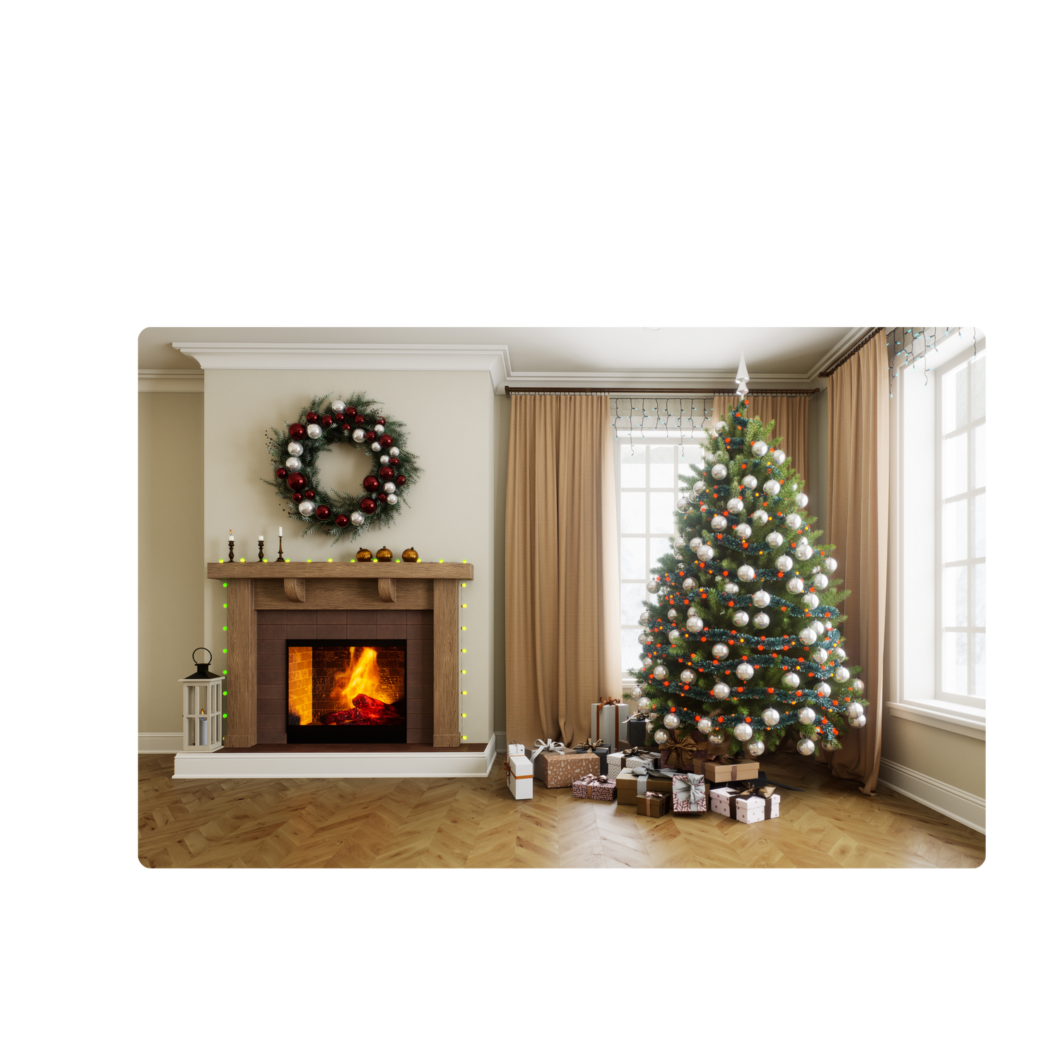 Nothing says Christmas like a home that glows. A wreath crowns the mantel while a crackling fire dances below, casting golden light across the room. The tree stands tall and twinkling, layered with ornaments and gifts are nestled at its feet.