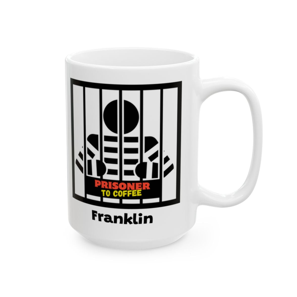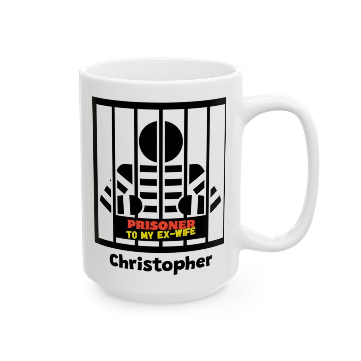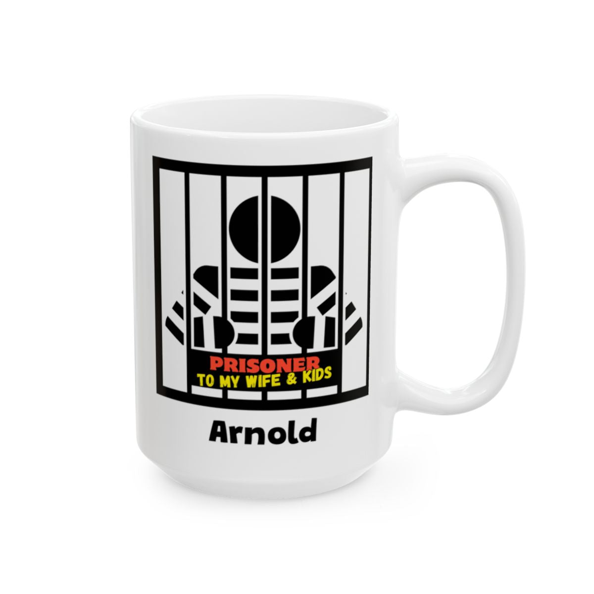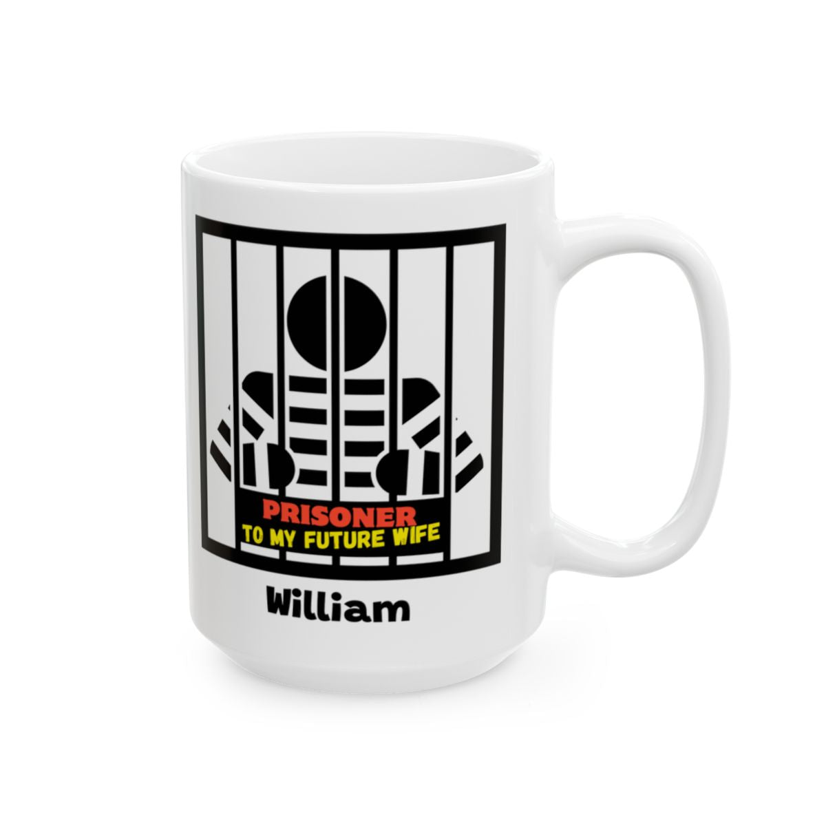 Warm his soul & make him smile as he sips his favorite cuppa hot drink out of this unique "prisoner" black ceramic mug. This gift will make that “aaahhh!” moment even better. Please personalize this mug with the name you choose (the "prisoner" or the "jailer") to show love & humor for holidays, birthdays, anniversaries, Father's Day or any occasion. It’s BPA and lead-free, microwave and dishwasher-safe, and made of black durable ceramic and available in 11-ounce and 15-ounce sizes. The high-quality makes this black ceramic mug the perfect gift for your true coffee, tea, or hot chocolate lover.