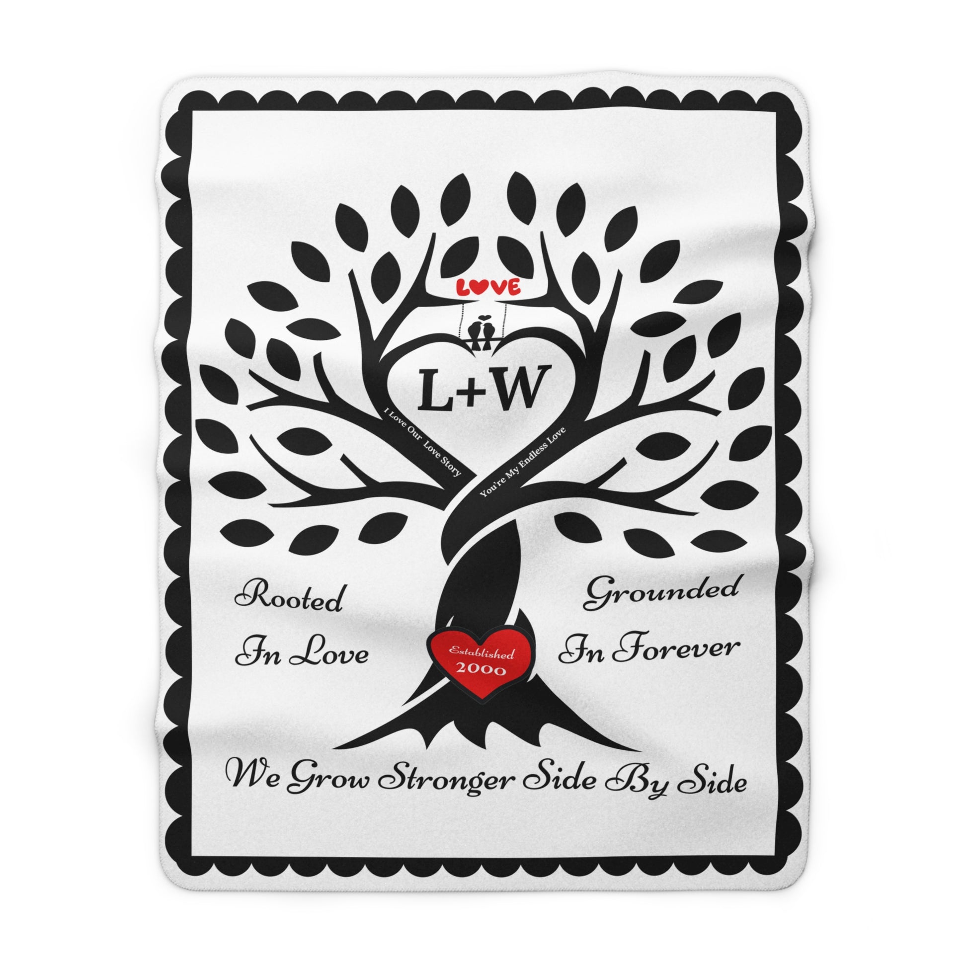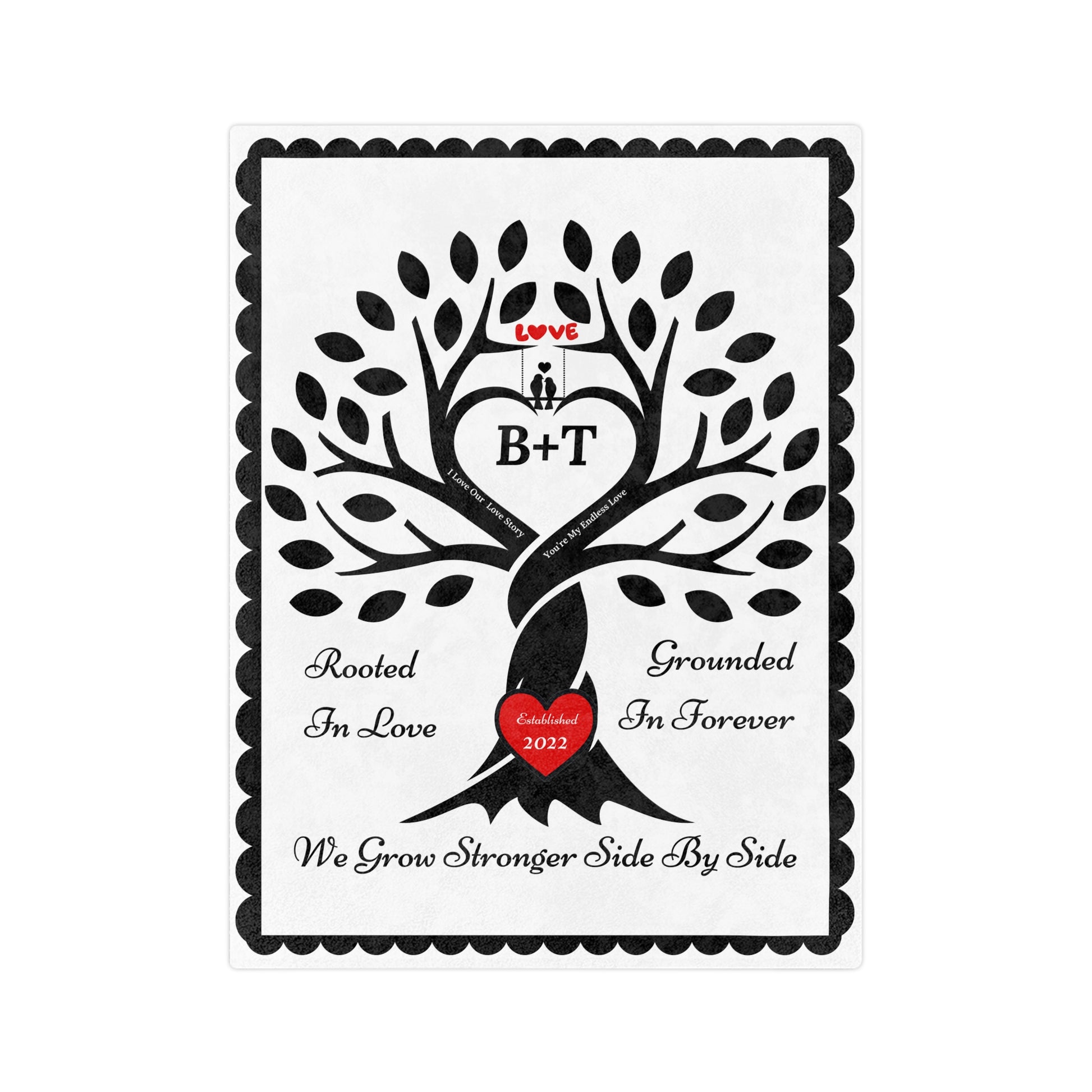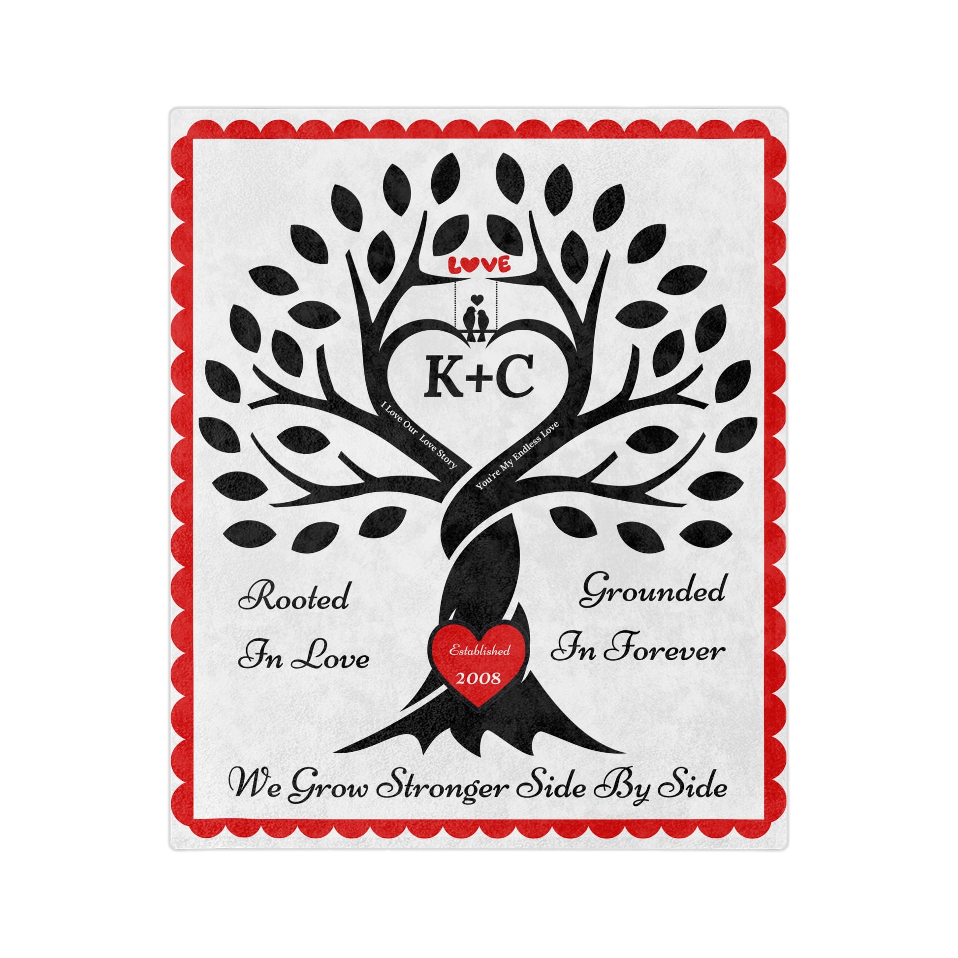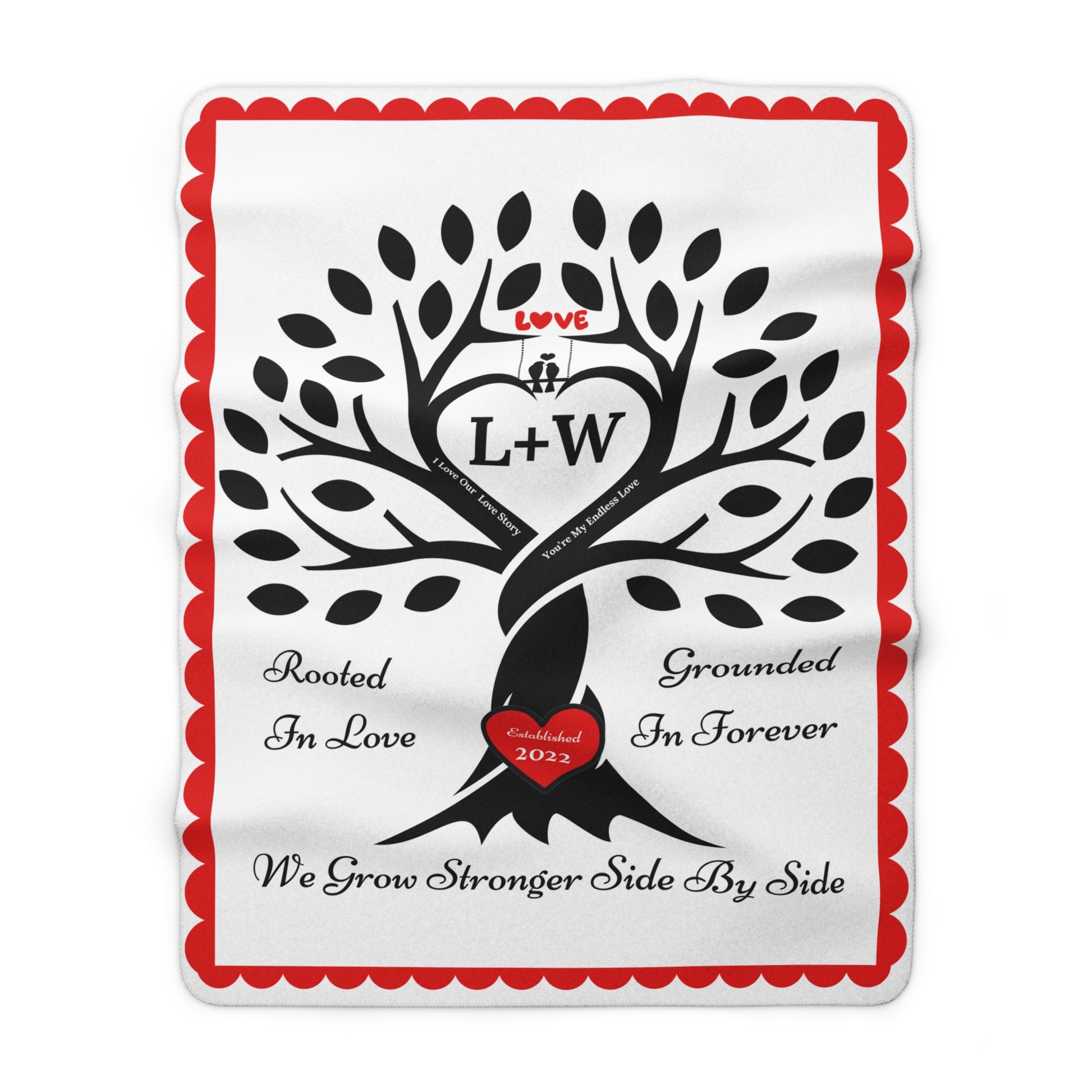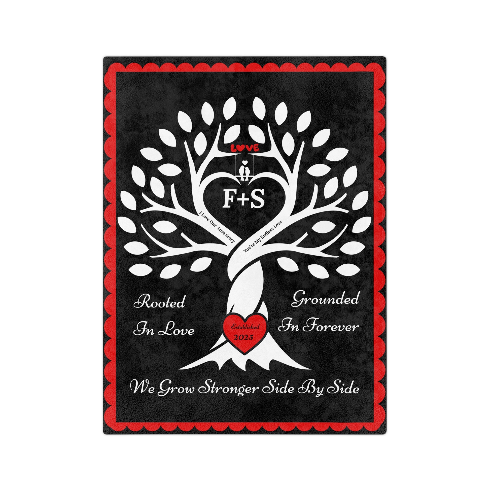 Wrap your story in warmth & love. This cozy keepsake features a strong tree whose intertwined trunk forms a heart, with a "carved" red heart at the roots and the sentiments “Rooted in Love,” “Grounded in Forever,” and “We Grow Stronger Side by Side.” Add your initials (e.g., W + L) to the center heart and your established year to the red heart at the root of the tree, for a one-of-a-kind heirloom that celebrates your bond.