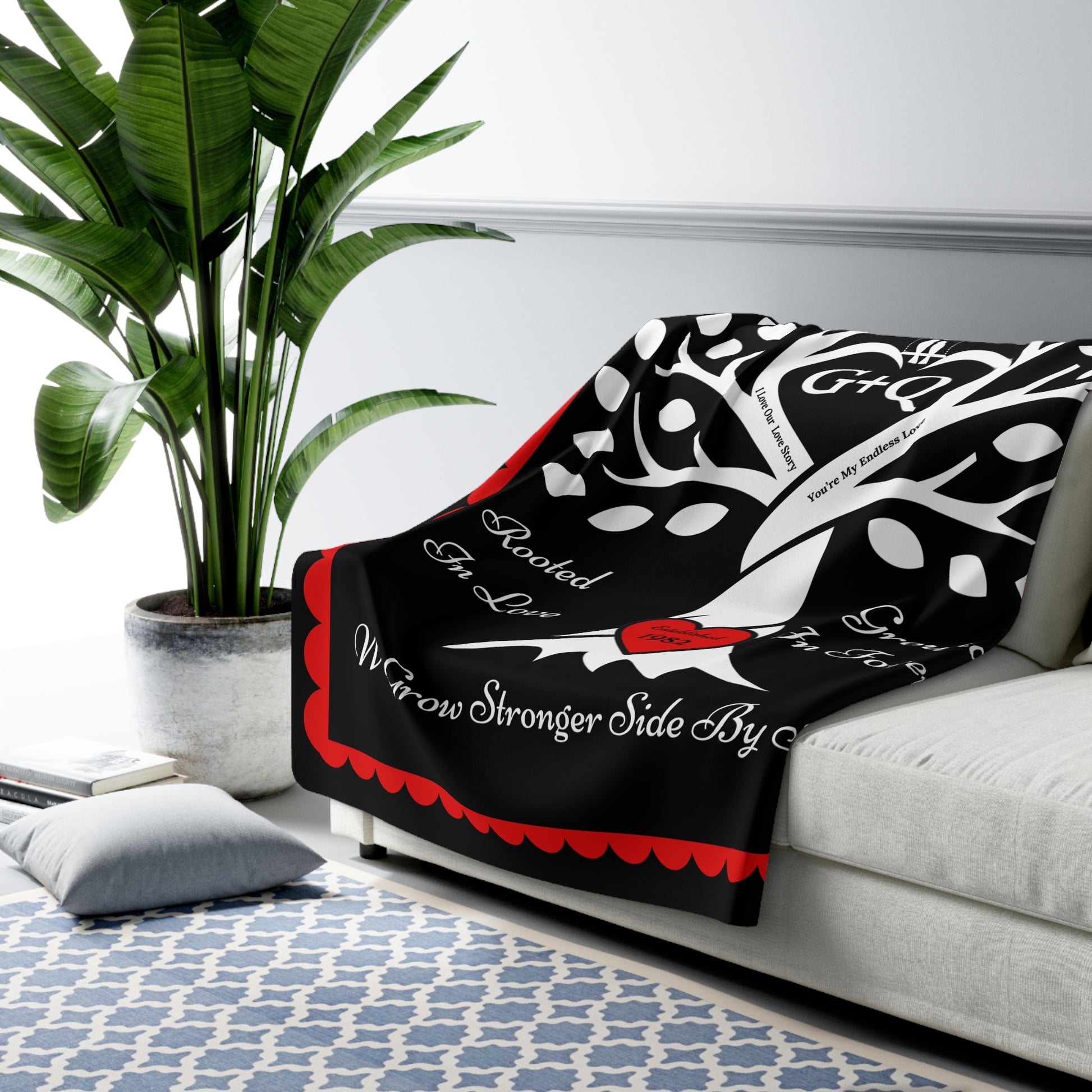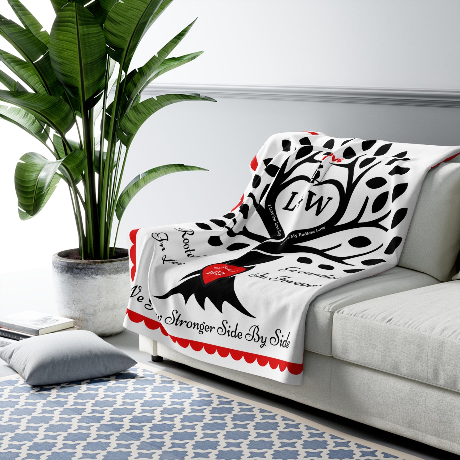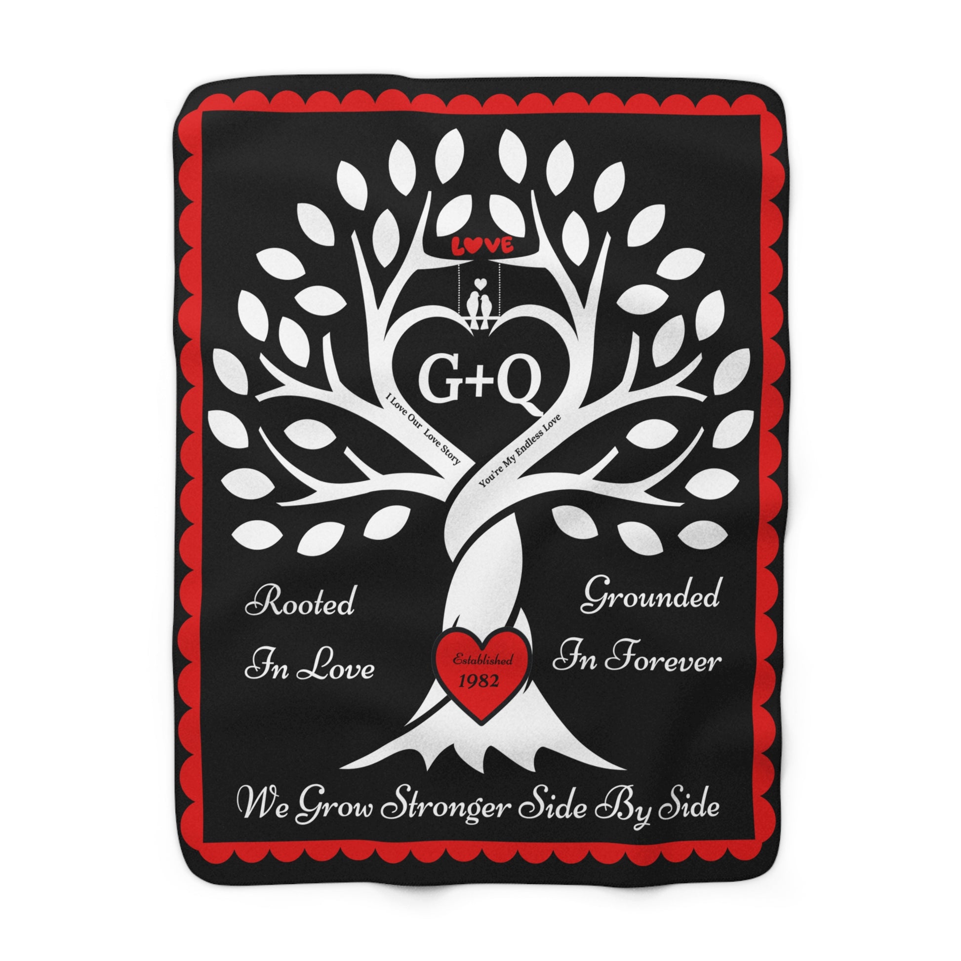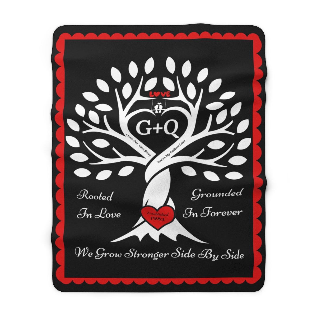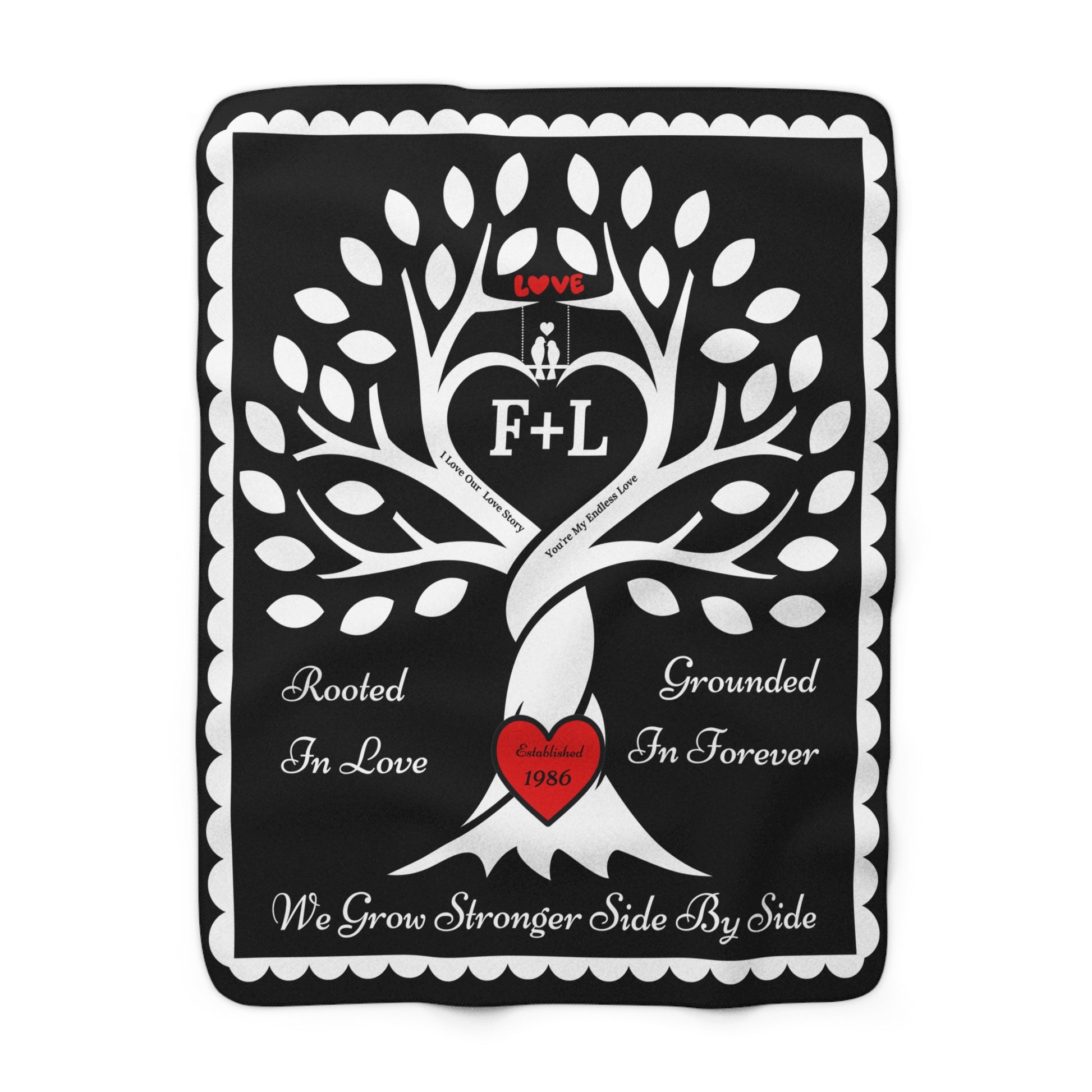 Wrap your story in warmth & love. This cozy keepsake features a strong tree whose intertwined trunk forms a heart, with a "carved" red heart at the roots and the sentiments “Rooted in Love,” “Grounded in Forever,” and “We Grow Stronger Side by Side.” Add your initials (e.g., W + L) to the center heart and your established year to the red heart at the root of the tree, for a one-of-a-kind heirloom that celebrates your bond.