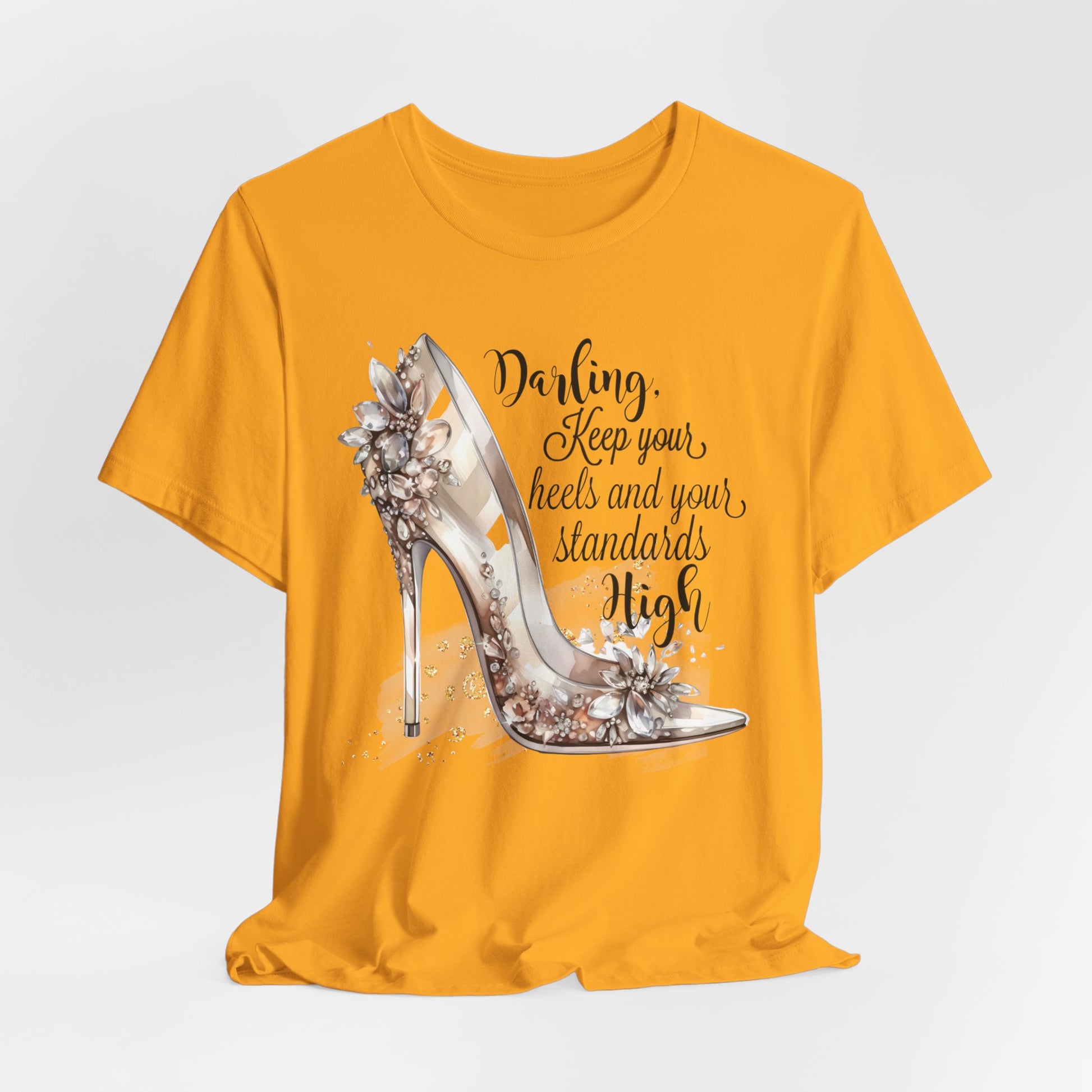 Our “Darling, Keep Your Heels and Your Standards High” t-shirt blends elegance with empowerment, making it the perfect statement piece for women who know their worth and aren’t afraid to show it. Featuring a chic high-heel illustration and a timeless message, this tee celebrates self-respect, confidence, and feminine strength.