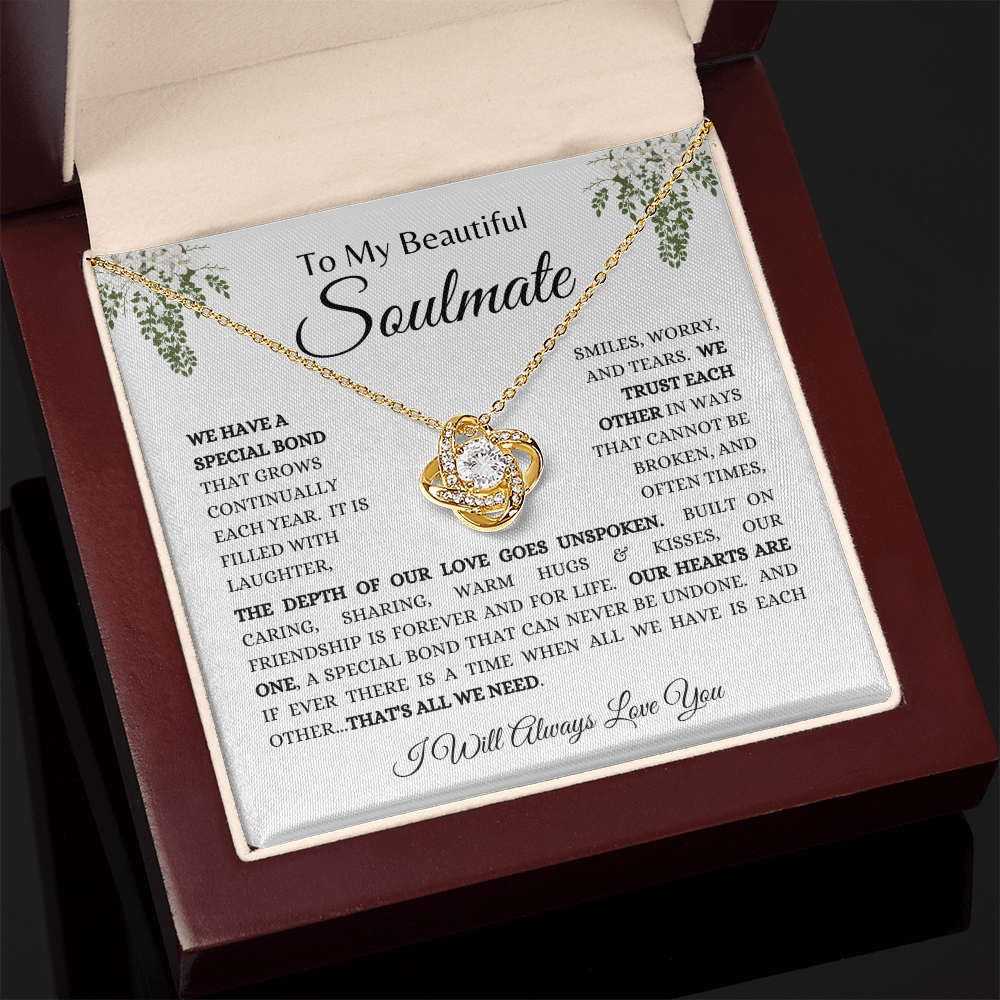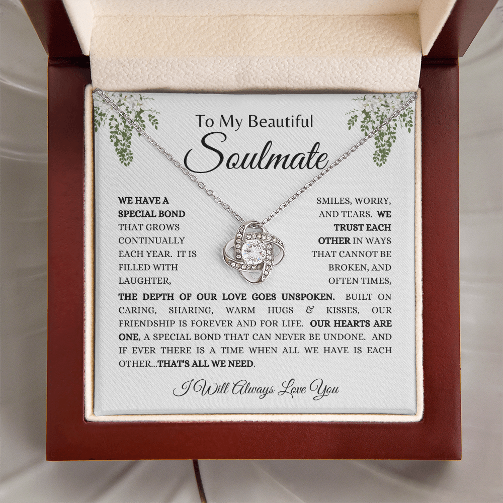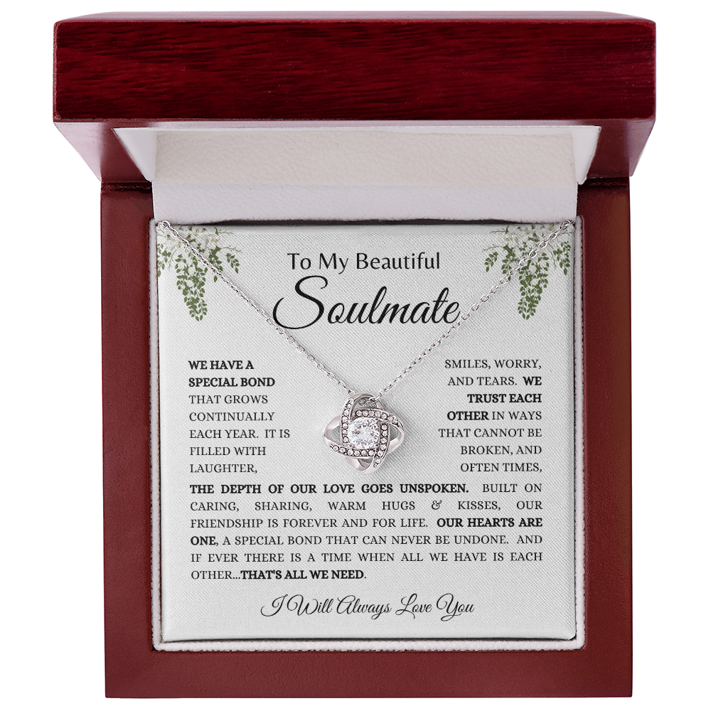 No one is perfect, neither is love. There were busy seasons, sharp words, missed moments. Yet you both stayed. Together you learned that your bond grew stronger every day, every week, every year—stitched with laughter and smiles, worry and tears. Let this exquisite necklace and message card be an unending reminder of the everlasting love you have for your Soulmate. Whether for Anniversary, Christmas, Valentine's Day, her Birthday, or Just Because, this gift will show her how much you care and that you're paying attention to her even when it seems you are not paying attention.