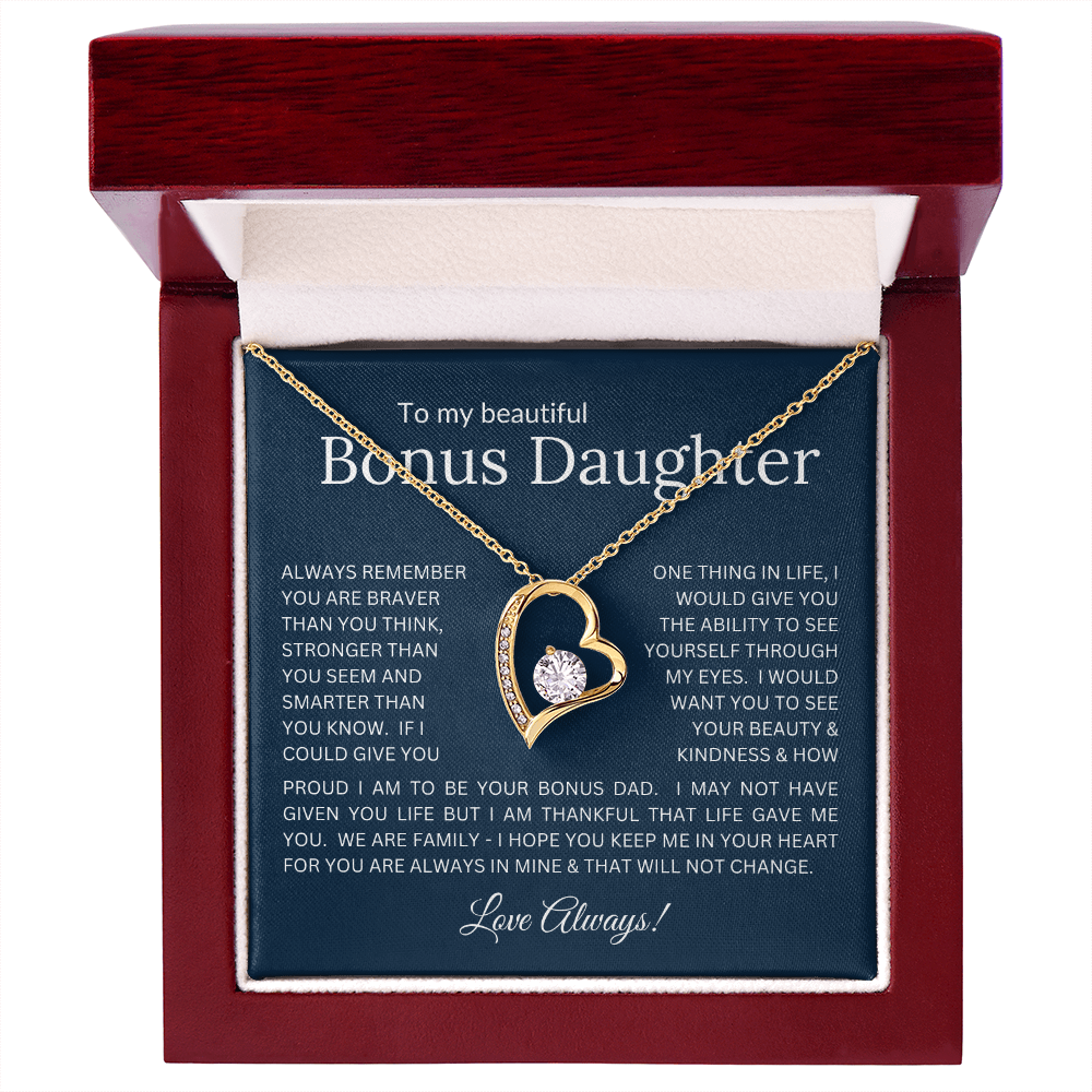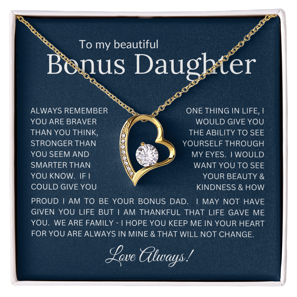 Let this exquisite "To My Bonus Daughter" Forever Love necklace and message card be an unending reminder of the everlasting love you have for your Bonus Daughter who wasn't born to you but she's your daughter now, nonetheless.  Whether for Christmas, Valentine's Day, her Birthday, Graduation, or just because, it's a gift she will love forever.