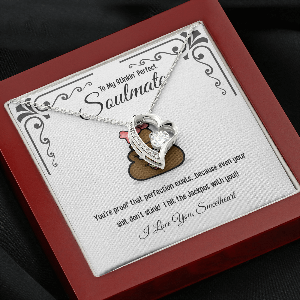 Celebrate the one whoâs perfect for youâflaws, quirks, and allâwith this playful âStinkinâ Perfect Soulmateâ heart necklace. Nestled in a keepsake gift box, the pendant sits above a cheeky message card that reads: âTo My Stinkin' Perfect Soulmate, Youâre proof that perfection exists⌠because even your shit donât stink! I hit the jackpot with you!! I Love You, Sweetheart.â Itâs flirty, funny, and irresistibly sweetâjust like your relationship.